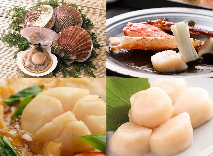 (和食)ホタテの刺身、ホタテの握り寿司、ホタテの貝焼き
