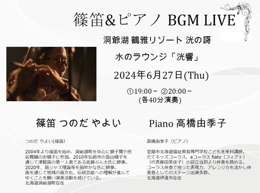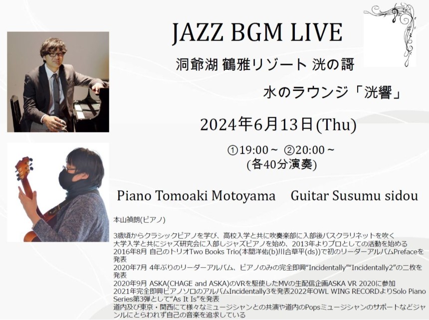 洞爺周辺を拠点に活動するアーティストたちの生演奏をぜひお聞きください。