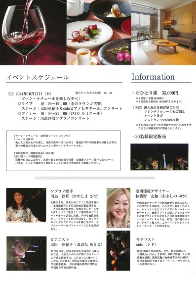 ディナータイムはレストラン ル ミエールにて、札幌出身のソプラノ歌手 川島沙耶さんのコンサートを開催いたします。素敵な歌声に耳を澄ませ、この日一日限りの特製フレンチコースと、ヴァン・ナチュールを心行くまでお楽しみください。