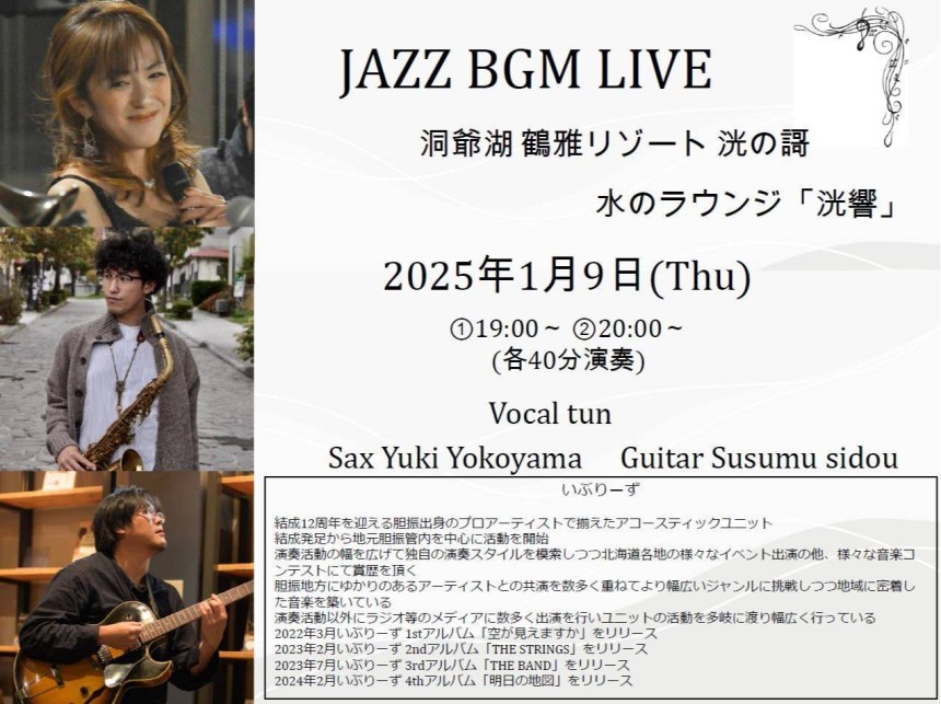 洞爺周辺を拠点に活動するアーティストたちの生演奏をぜひお聞きください。