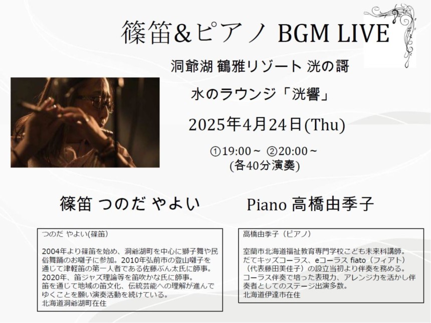洞爺周辺を拠点に活動するアーティストたちの生演奏をぜひお聞きください。