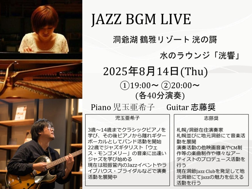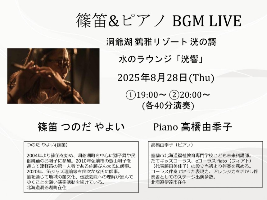 洞爺周辺を拠点に活動するアーティストたちの生演奏をぜひお聞きください。