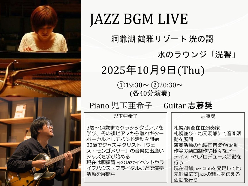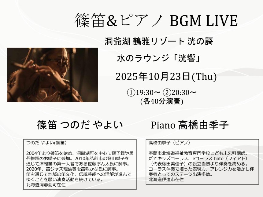 洞爺周辺を拠点に活動するアーティストたちの生演奏をぜひお聞きください。