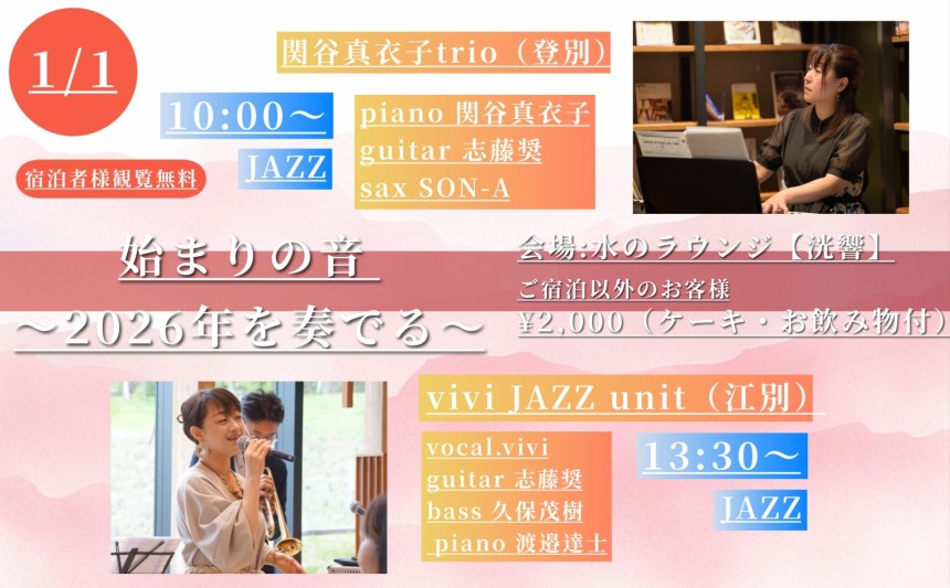水のラウンジ「洸響」では、お正月ならではの特別LIVE演奏を開催いたします。