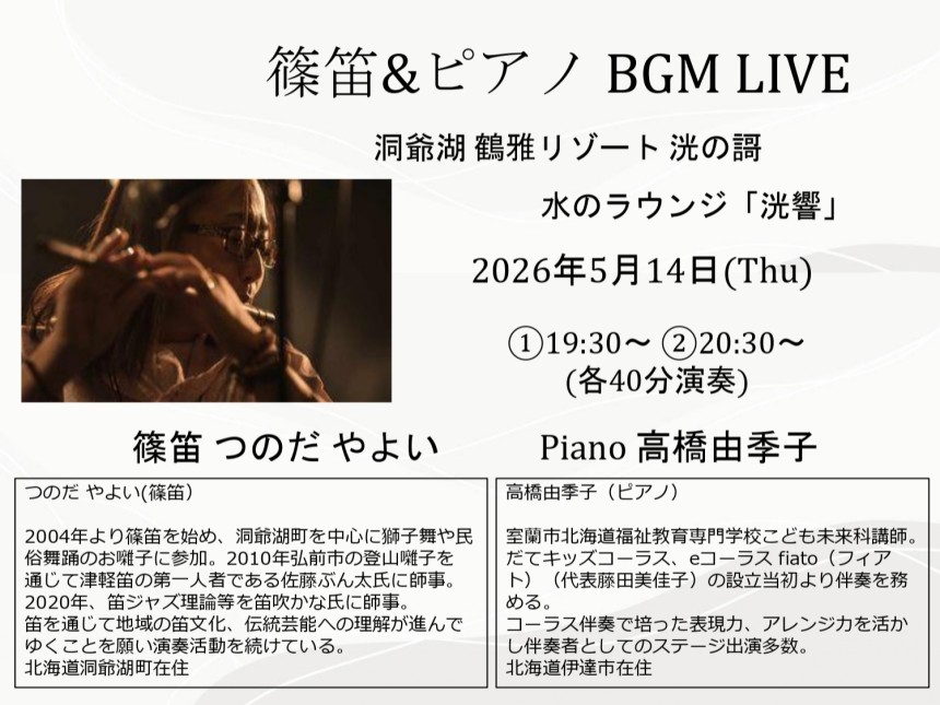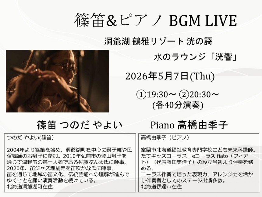 洞爺周辺を拠点に活動するアーティストたちの生演奏をぜひお聞きください。